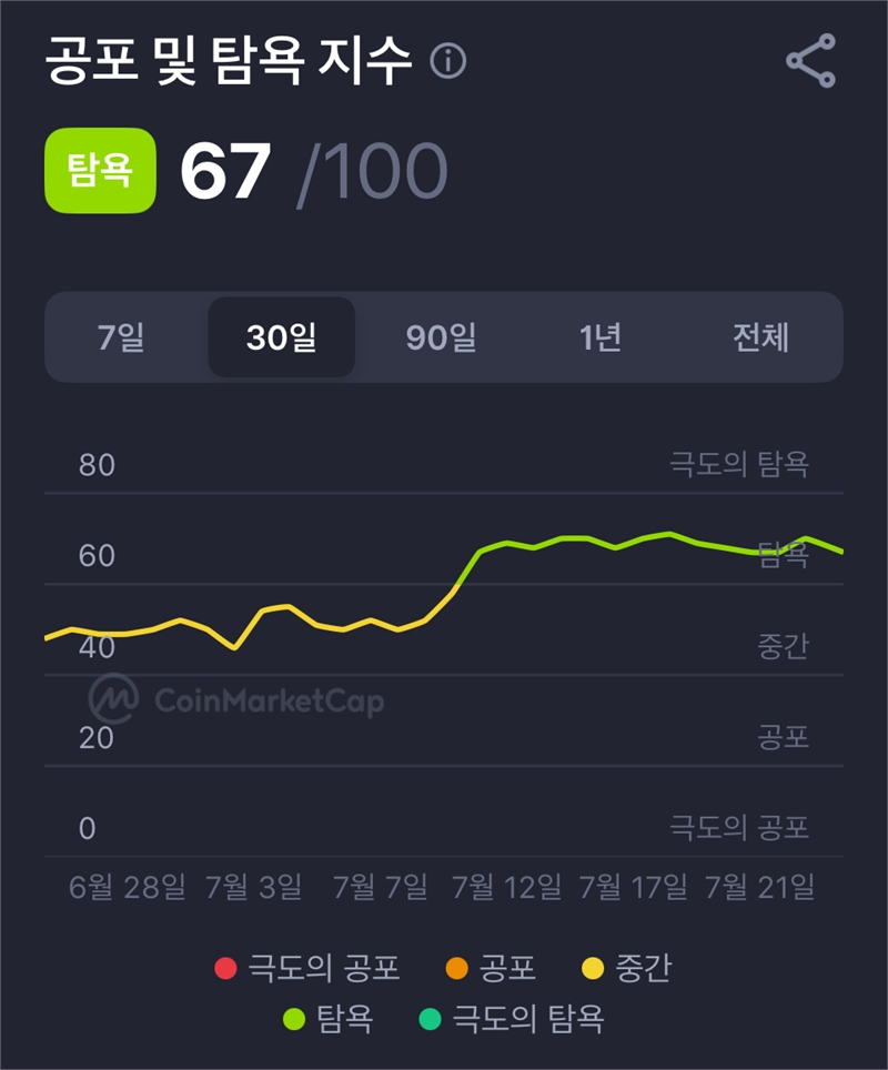 공포탐욕지수가 70을 기록하며 탐욕 구간에 머물러 있다. 이는 최근 조정이 공포심리에 의한 것이 아닌 일시적인 이익 실현에 따른 것임을 뒷받침한다.